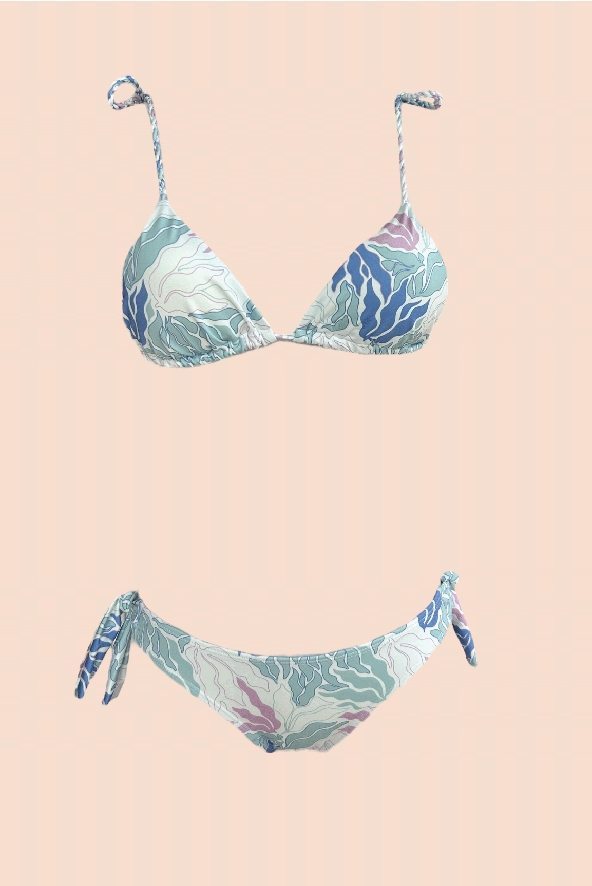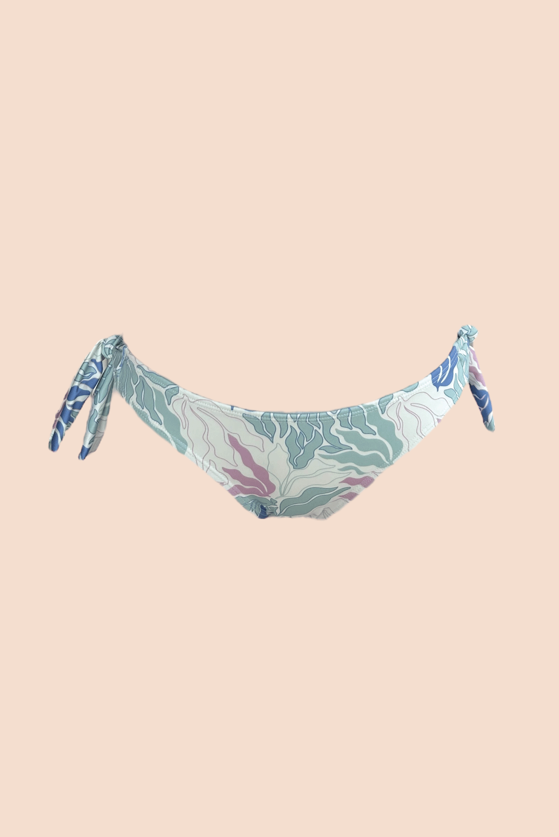 El Aurora Bottom Tiras Gruesas combina comodidad y funcionalidad en un diseño único y moderno. Esta diseñado con un estampado con formas que evocan hojas marinas o corales suaves, y una paleta que mezcla lavanda, azul sereno, verde menta y toques blancos, transmitiendo frescura y calma. Este bottom incluye tiras gruesas ajustables en los costados para un ajuste seguro y personalizado. Incorpora un accesorio distintivo de dije en níquel con forma de salvavidas. Confeccionado a mano con tela Eco Friendly de 82% poliéster reciclado y 18% lycra, ofrece protección solar, resistencia al cloro y secado rápido.