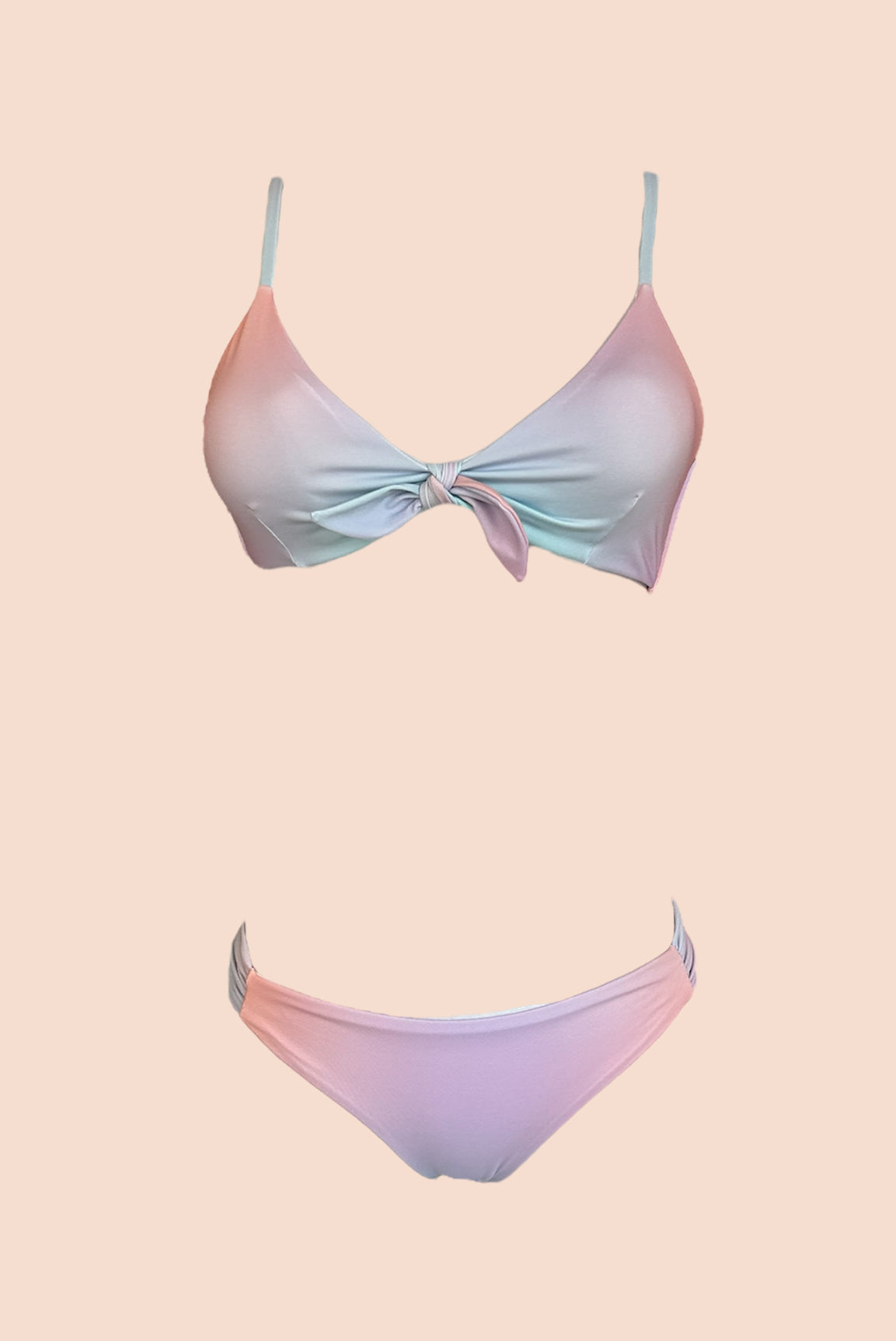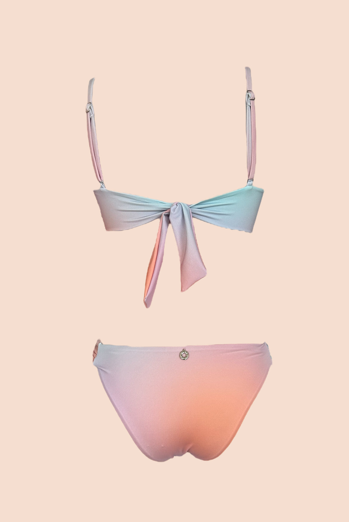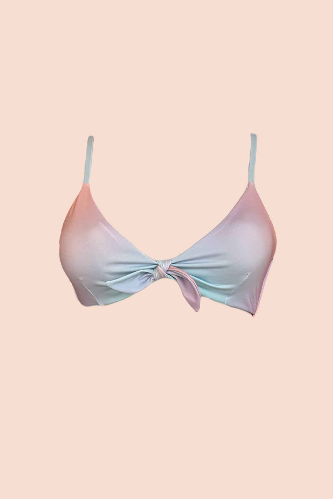 El Duna Top Bikini es un diseño triangular estampado con un lazo frontal que combina estilo y funcionalidad. Sus tirantes ajustables permiten un ajuste cómodo y personalizado, mientras que las copas suaves removibles ofrecen soporte adicional. Fabricado con 78% poliéster reciclado y 22% elastano, este top de bikini es respetuoso con el medio ambiente y cuenta con protección solar, resistencia del color y secado rápido. Su estampado degradado en tonos rosado, naranja y menta añade un toque vibrante, complementado por un exclusivo dije de salvavidas en níquel.