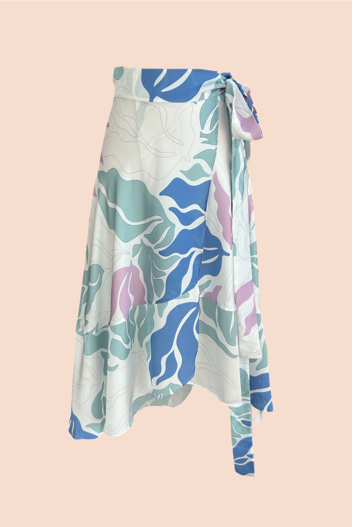 La Falda Aurora es una prenda única y sofisticada, estampado con formas que evocan hojas marinas o corales suaves, y una paleta que mezcla lavanda, azul sereno, verde menta y toques blancos, transmitiendo frescura y calma. Su diseño de talle alto y amarre ajustable en la cintura, hace que esta falda larga sea ideal para complementar vestidos de baño o para prenda casual para días relajados. Fabricada en 100% poliéster con fibra satinada, su textura sedosa y ligera asegura estilo y comodidad. Sus medidas de 94 cm de ancho y 85 cm de largo la convierten en una opción versátil y elegante.