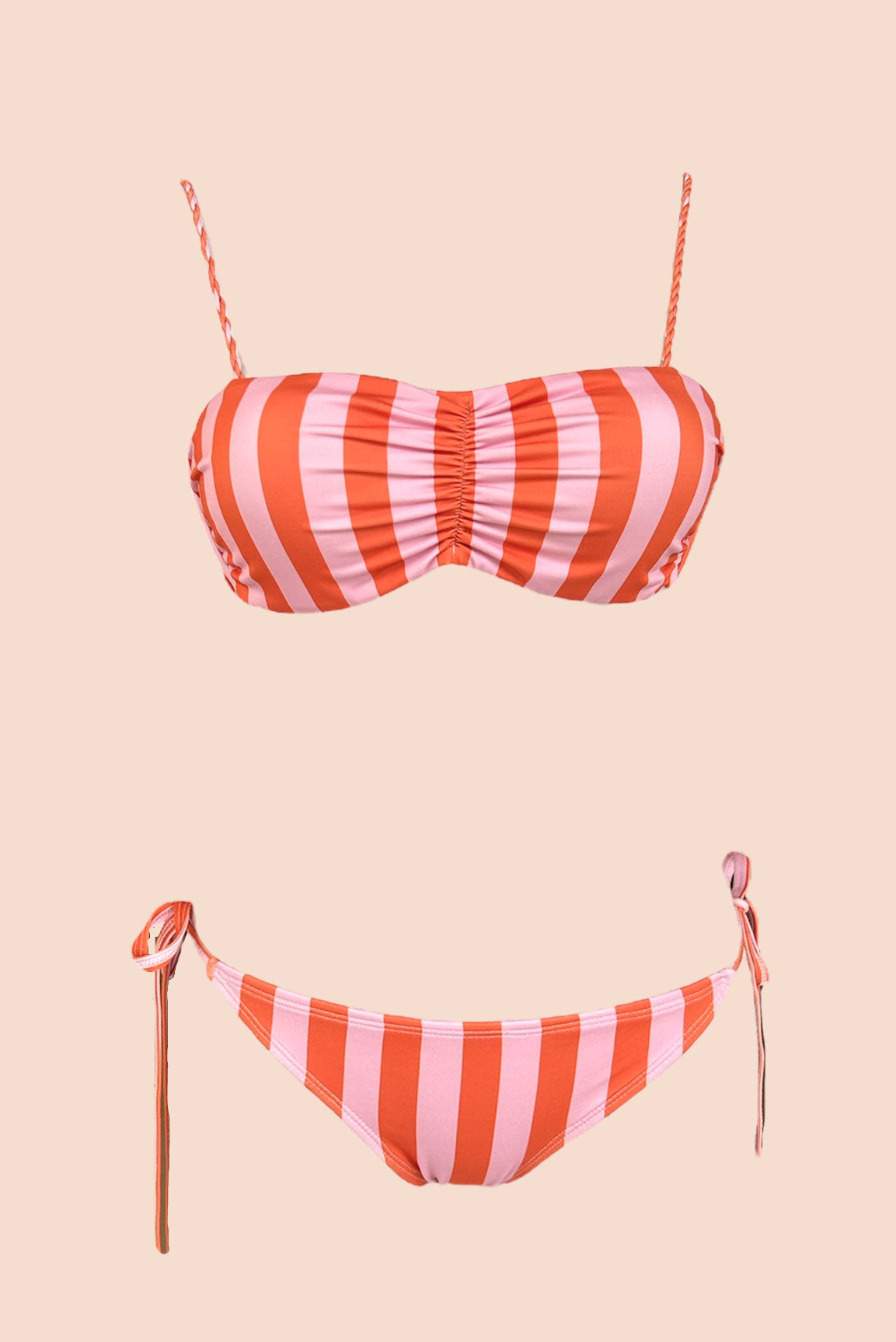El Pop Top Fruncido es un vestido de baño vibrante con estampado de franjas rosa y naranja, evocan el espíritu alegre del verano con un toque retro y lleno de energía. Un print vibrante y moderno que ilumina cada look con color y actitud. El top presenta un escote curvo con fruncido suave en el centro que realza el busto, y delicadas tiras trenzadas hechas a mano que aportan un toque artesanal único. La espalda es ajustable con un lazo grueso. La tela destaca por su excelente elasticidad, resistencia al cloro, protección UV y ecoamigable, ideal para disfrutar del sol con estilo y comodidad. Composición 82% poliéster reciclado y 18% lycra.