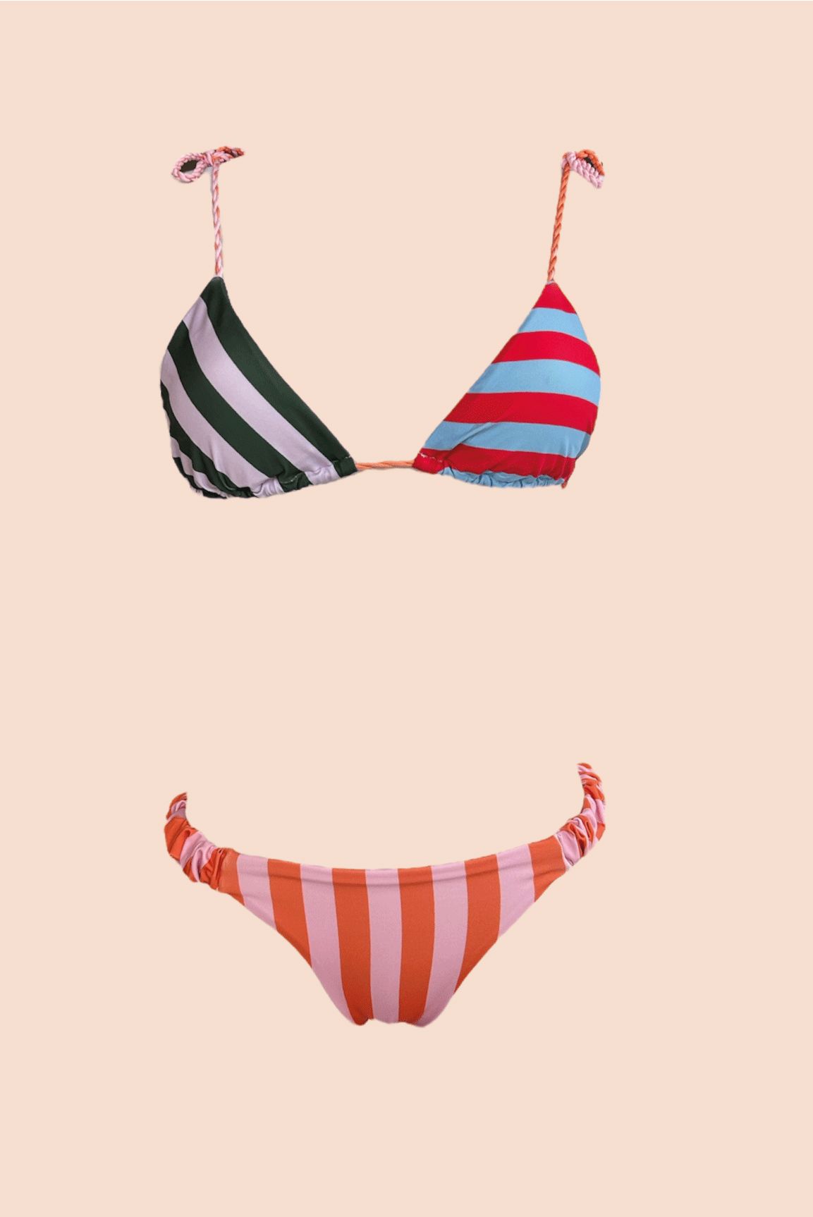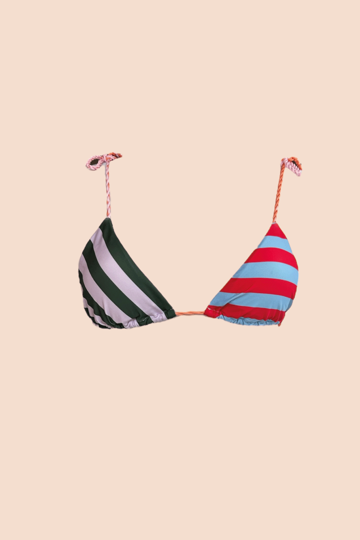 El Pop Top Triángulo combina comodidad y estilo con un diseño artesanal único. Este top esta diseñado con un estampado de franjas osa y naranja, rojo y azul claro, y verde y lila, evocan el espíritu alegre del verano con un toque retro y lleno de energía. Un print vibrante y moderno que ilumina cada look con color y actitud. Confeccionado a mano con tela Eco Friendly de 82% poliéster reciclado y 18% lycra, este top presenta tirantes trenzados ajustables para un ajuste perfecto en hombros y espalda. Equipado con copas suaves removibles y un accesorio exclusivo de dije en níquel con forma de salvavidas, este top es ideal para lucir con confianza. Ofrece protección solar, resistencia al cloro y secado rápido.