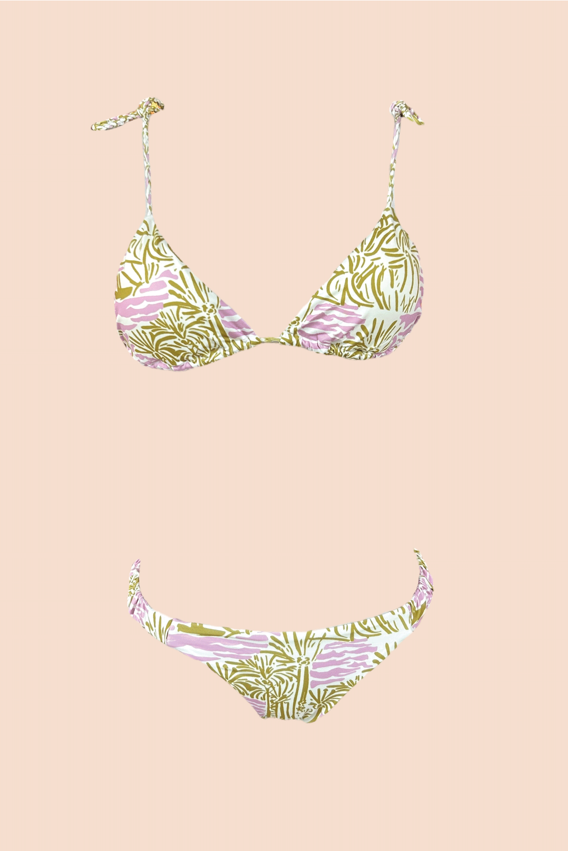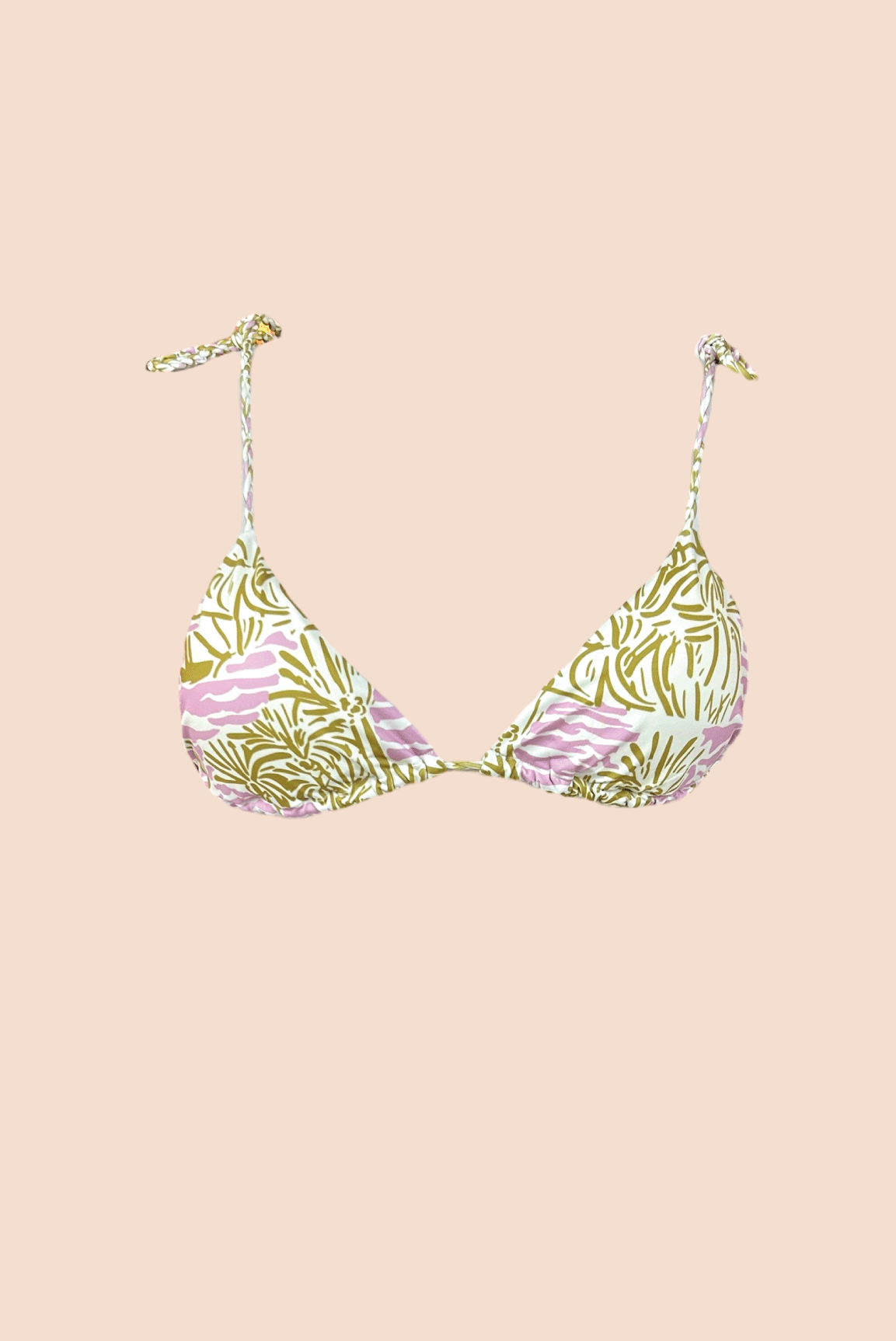 El Solaris Top Triángulo combina comodidad y estilo con un diseño artesanal único. Este top esta diseñado con una combinación de verde pistacho y lila, evoca la frescura de las palmas junto al mar y la suavidad del horizonte al atardecer. Confeccionado a mano con tela Eco Friendly de 82% poliéster reciclado y 18% lycra, este top presenta tirantes trenzados ajustables para un ajuste perfecto en hombros y espalda. Equipado con copas suaves removibles y un accesorio exclusivo de dije en níquel con forma de salvavidas, este top es ideal para lucir con confianza. Ofrece protección solar, resistencia al cloro y secado rápido.