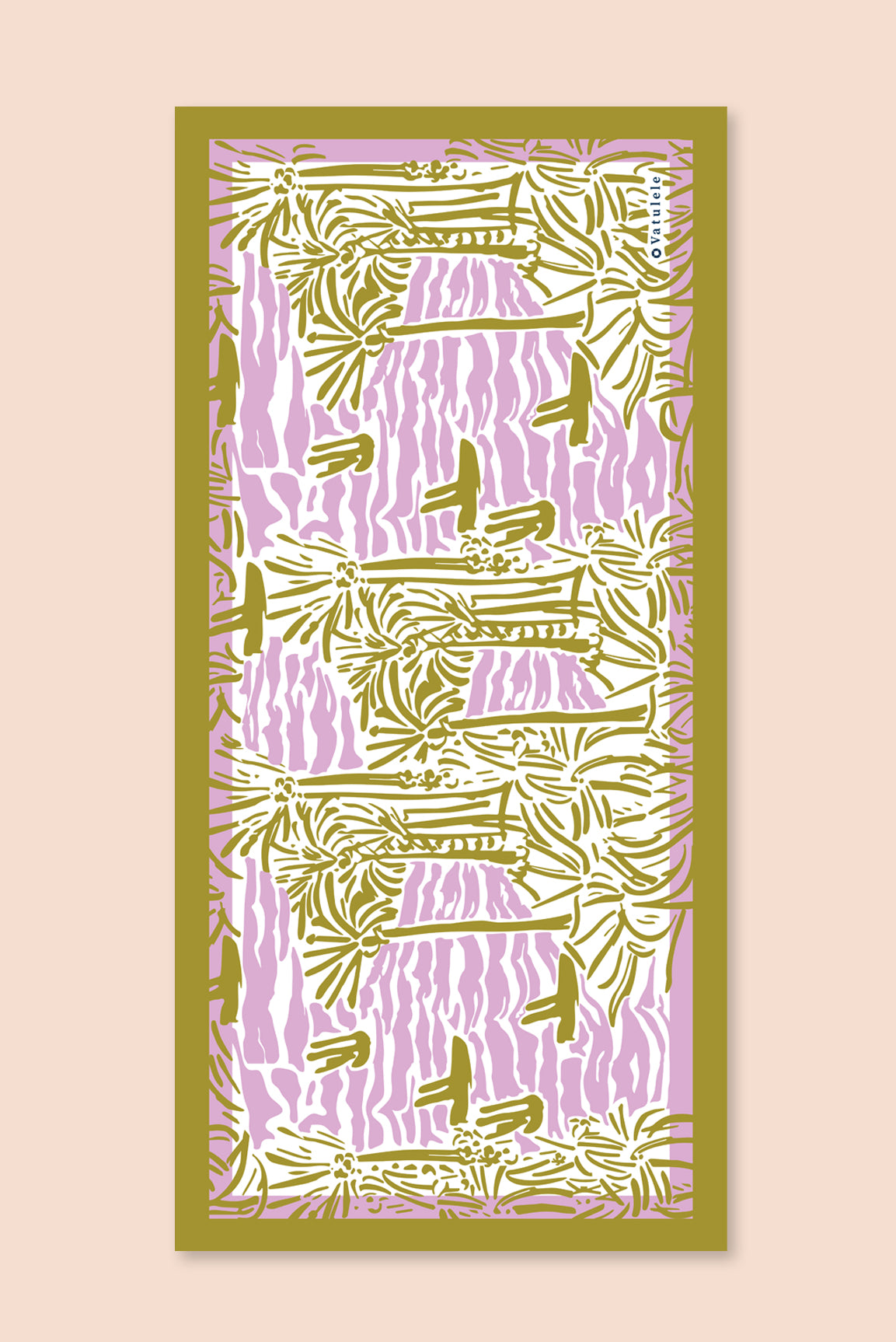 La Toalla Solaris Rectangular tiene un llamativo estampado diseñado con una combinación de verde pistacho y lila, evoca la frescura de las palmas junto al mar y la suavidad del horizonte al atardecer. Un print vibrante y moderno que ilumina cada look con color y actitud. El reverso luce un delicado patrón de flores silvestres blancas sobre un fondo suave, que aporta un aire romántico y natural al diseño. Cuenta con una tela de microfibra de tacto suave, estampada por ambos lados, liviana y de secado rápido.