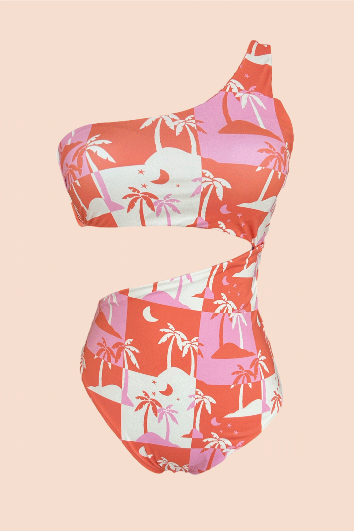 El Tonka One Piece Escote Asimétrico es un enterizo confeccionado a mano que combina diseño moderno y funcionalidad. Con Su estampado de palmeras con cuadros en tonos naranja, rosado y beige le confiere un estilo fresco y moderno, este traje de baño presenta un escote asimétrico y una apertura lateral que resaltan la silueta. Ofrece control de abdomen y copas suaves removibles para mayor soporte y comodidad. Fabricado con 80% poliéster y 20% lycra, garantiza protección solar, resistencia del color y secado rápido. Un exclusivo dije de salvavidas en níquel añade un toque distintivo.